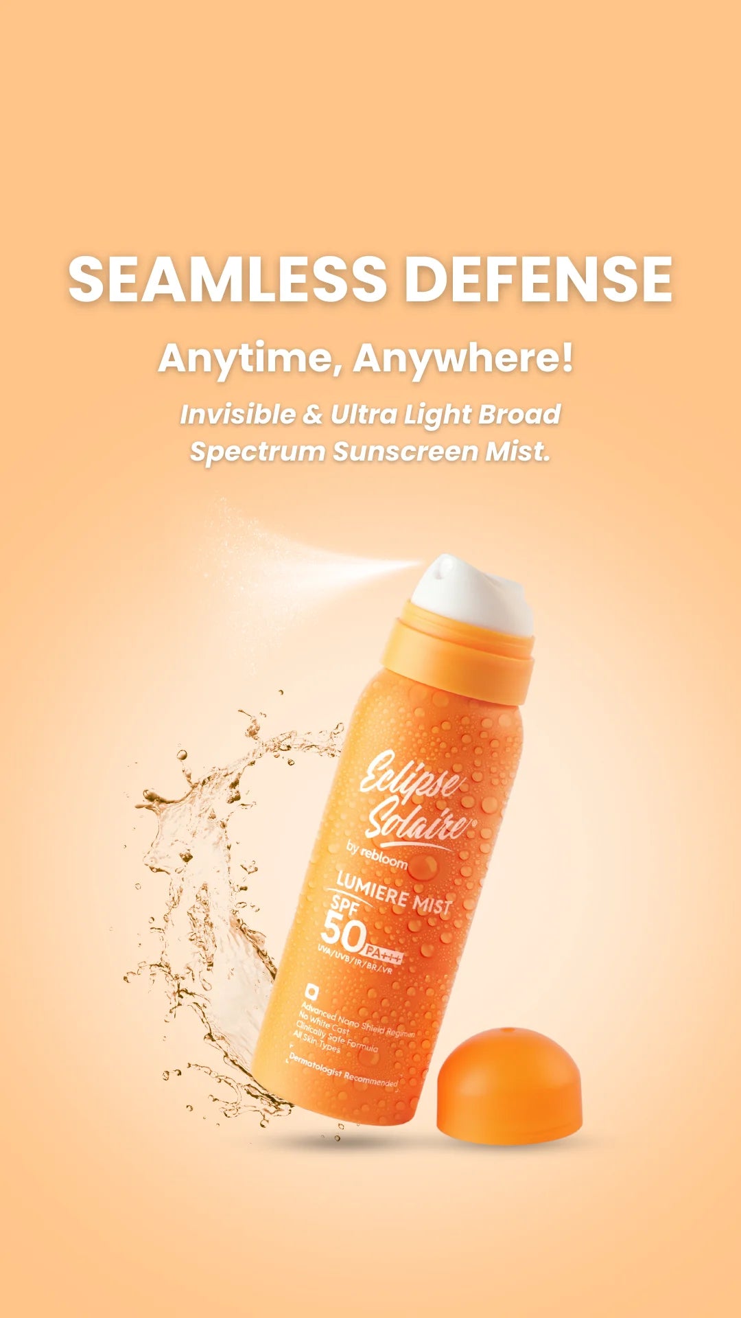 Ultra-light Invisible Sunscreen Spray With Effortless sun protection in just 60 seconds. This mist delivers broad-spectrum defense with a weightless feel — perfect for quick touch-ups and day on the go.